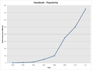 Facebook popularity. Active users of Facebook increased from just a million in 2004 to over 750 million in 2011.