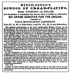 Advertisement for the Organ Sonatas in the Musical World, 24 July 1845