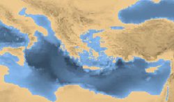 The map on the right shows how the region would look about 12,000 years ago, or 10,000 BC, when the sea level would have been 125 meters lower than today. The Peloponnese was connected to the mainland and the Corinthian Gulf was not formed. Islands around Attica, such as Aegina, Salamis and Euboea, were part of the mainland. The Cyclades formed a big island known as Aegeis, while Bosporus and Hellespont was not formed yet.