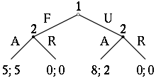 In the game pictured to the left, there are two players. Player 1 moves first and chooses either F or U. Player 2 sees Player 1's move and then chooses A or R. Suppose that Player 1 chooses U and then Player 2 chooses A, then Player 1 gets 8 and Player 2 gets 2.