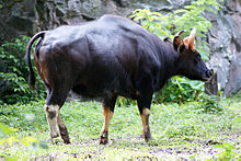 The gaur is a strong and massively built species with a high convex ridge on the forehead between the horns, which bends forward, causing a deep hollow in the profile of the upper part of the head. There is a prominent ridge on the back. The ears are very large; the tail only just reaches the hocks, and in old bulls the hair becomes very thin on the back. In colour, the adult male gaur is dark brown, approaching black in very old individuals; the upper part of the head, from above the eyes to the nape of the neck, is, however, ashy grey, or occasionally dirty white; the muzzle is pale coloured, and the lower part of the legs are pure white or tan. The cows and young bulls are paler, and in some instances have a rufous tinge, which is most marked in groups inhabiting dry and open districts. The tail is shorter than in the typical oxen, reaching only to the hocks. They have a distinct ridge running from the shoulders to the middle of the back; the shoulders may be as much as 12 cm (4.7 in) higher than the rump. This ridge is caused by the great length of the spinous processes of the vertebrae of the fore-part of the trunk as compared with those of the loins. The hair is short, fine and glossy, and the hooves are narrow and pointed.