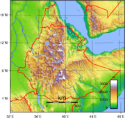 Between the valley of the Upper Nile and Ethiopia's border with Eritrea is a region of elevated plateaus from which rise the various tablelands and mountains that constitute the Ethiopian Highlands. On nearly every side, the walls of the plateaus rise abruptly from the plains, constituting outer mountain chains. The highlands are thus a clearly marked orographic division. In Eritrea, the eastern wall of this plateau runs parallel to the Red Sea from Ras Kasar ( 18° N) to Annesley Bay (also known as the Bay of Zula) ( 15° N). It then turns due south into Ethiopia and follows closely the line of 40° E for some 600 km (373 mi). About 9° N there is a break in the wall, through which the Awash River flows eastward. The main range at this point trends southwest, while south of the Awash Valley, which is some 1,000 m (3,281 ft) below the level of the mountains, another massif rises in a direct line south. This second range sends a chain (the Ahmar mountains) eastward toward the Gulf of Aden. The two chief eastern ranges maintain a parallel course south by west, with a broad upland valley in between — in which valley are a series of lakes — to about 3° N, the outer (eastern) spurs of the plateau still keeping along the line of 40° E. The southern escarpment of the plateau is highly irregular, but has a general direction northwest and southeast from 6° N to 3° N. It overlooks the depression in which is Lake Turkana and — east of that lake — the southern Debub Omo Zone (part of the larger Southern Nations, Nationalities, and Peoples Region). The western wall of the plateau from 6° N to 11° N is well marked and precipitous. North of 11° N the hills turn more to the east and fall more gradually to the East Sudanian savanna plains at their base. On its northern face the plateau falls in terraces to the level of the eastern Sudan. The eastern escarpment is the best defined of these outer ranges. It has a mean height of 2,100 to 2,400 m (6,890 to 7,874 ft), and in many places rises almost perpendicularly from the plain. Narrow and deep clefts, through which descend mountain torrents that lose themselves in the sandy soil of the Eritrean coast, afford means of reaching the plateau, or the easier route through the Awash Valley may be chosen. On surmounting this rocky barrier, the traveller finds that the encircling rampart rises little above the normal level of the plateau.