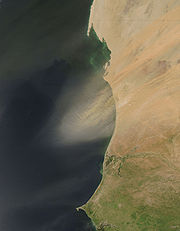 The Coastal Zone, or Sub-Canarian Zone, extends the length of the approximately 754-kilometer (469 mi) long Atlantic coast. Prevailing oceanic trade winds from the Canary Islands modify the influence of the harmattan, producing a humid but temperate climate. Rainfall here is minimal; in Nouadhibou it averages less than 30 millimeters (1.18 in) annually and occurs between July and September. Temperatures are moderate, varying from mean maximums of 28 and 32 °C (82.4 and 89.6 °F) for Nouadhibou and Nouakchott, respectively, to mean minimums of 16 and 19 °C (60.8 and 66.2 °F).