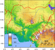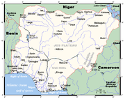 Nigeria is a country in West Africa. Nigeria shares land borders with the Republic of Benin in the west, Chad and Cameroon in the east, and Niger in the north. Its coast lies on the Gulf of Guinea in the south and it borders Lake Chad to the northeast. Noted geographical features in Nigeria include the Adamawa highlands,Mambilla plateau, Jos Plateau and Obudu Plateaus and the Niger River and Niger Delta. The country's geographic coordinates are 10°00′N 8°00′E