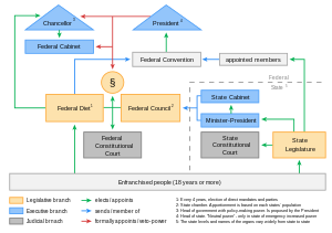 Germany is a federal, parliamentary, representative democratic republic. The German political system operates under a framework laid out in the 1949 constitutional document known as the Grundgesetz (Basic Law). Amendments generally require a two-thirds majority of both chambers of parliament; the fundamental principles of the constitution, as expressed in the articles guaranteeing human dignity, the separation of powers, the federal structure, and the rule of law are valid in perpetuity.