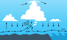 Schematic cross section through a sea breeze front. If the air inland is moist, cumulus often marks the front.