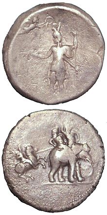 Silver coin depicting the Greek king Demetrius I of Bactria wearing an elephant scalp, symbol of his conquest of India in 180 BCE.