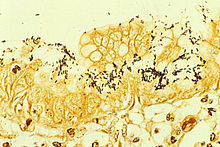 Helicobacter pylori ( / ˌ h ɛ l ɪ k ɵ ˈ b æ k t ər p aɪ ˈ l ɔər aɪ /; H. pylori), previously named Campylobacter pyloridis, is a Gram-negative, microaerophilic bacterium found in the stomach. It was identified in 1982 by Barry Marshall and Robin Warren, who found that it was present in patients with chronic gastritis and gastric ulcers, conditions that were not previously believed to have a microbial cause. It is also linked to the development of duodenal ulcers and stomach cancer. However, over 80 percent of individuals infected with the bacterium are asymptomatic and it has been postulated that it may play an important role in the natural stomach ecology.