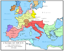 Roman authority in the Western part of the Empire collapsed and the western provinces soon were to be dominated by three great powers, the Franks ( merovingian dynasty) in Francia 481–843 AD (covered much of present France and Germany), the Visigothic kingdom 418–711 AD in the Iberian Peninsula and the Ostrogothic kingdom 493–553 AD in Italy and parts of Balkan this kingdom were later replaced by the Kingdom of the Lombards 568–774 AD. These new powers of the west were the continuers of the Roman traditions until they evolved into a merge of Roman and Germanic cultures. In Italy Theodoric the Great began the cultural romanization of the new world he had built, he made Ravenna a centre of Romano-Greek culture of art and his court fostered a flowering of literary and the philosophical in Latin. in Iberia the Visigoth made Visigothic Code