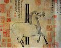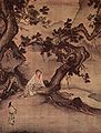 The ideologies of Confucianism, Daoism, and Buddhism played important roles in East Asian art. Medieval Song Dynasty painters such as Lin Tinggui and his Luohan Laundering (housed in the Smithsonian Freer Gallery of Art) of the 12th century are excellent examples of Buddhist ideas fused into classical Chinese artwork. In the latter painting on silk (image and description provided in the link), bald-headed Buddhist Luohan are depicted in a practical setting of washing clothes by a river. However, the painting itself is visually stunning, with the Luohan portrayed in rich detail and bright, opaque colors in contrast to a hazy, brown, and bland wooded environment. Also, the tree tops are shrouded in swirling fog, providing the common "negative space" mentioned above in East Asian Art.