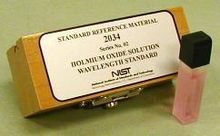 Holmium is one of the colorants used for cubic zirconia and glass, providing yellow or red coloring. Glass containing holmium oxide and holmium oxide solutions (usually in perchloric acid) have sharp optical absorption peaks in the spectral range 200–900 nm. They are therefore used as a calibration standard for optical spectrophotometers, and are available commercially.