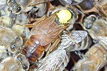 A queen bee: a coloured dot, in this case yellow, is added to assist the beekeeper in identifying the queen.