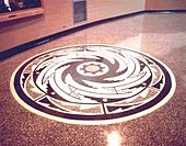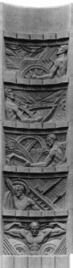 Surrounding the base of the monument is a terrazzo floor embedded with a "star map". The map depicts the Northern Hemisphere sky at the moment of President Roosevelt's dedication of the dam. This is intended to help future astronomers, if necessary, calculate the exact date of dedication. The 30 feet (9.1 m) high bronze figures, dubbed "Winged Figures of the Republic", were each formed in a continuous pour. To put such large bronzes into place without marring the highly polished bronze surface, they were placed on ice and guided into position as the ice melted. Hansen's bas-relief on the Nevada elevator tower depicts the benefits of the dam: flood control, navigation, irrigation, water storage, and power. The bas-relief on the Arizona elevator depicts, in his words, "the visages of those Indian tribes who have inhabited mountains and plains from ages distant."