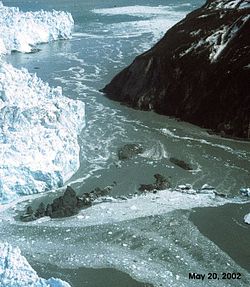 The Hubbard Glacier ice margin has continued to advance for about a century. In May 1986, the Hubbard Glacier surged forward, blocking the outlet of Russell Fiord and creating "Russell Lake." All that summer the new lake filled with runoff; its water level rose 25 meters, and the decrease in salinity threatened its sea life.