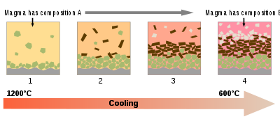 As magma cools, minerals typically crystallize from the melt at different temperatures ( fractional crystallization). As minerals crystallize, the composition of the residual melt typically changes. If crystals separate from melt, then the residual melt will differ in composition from the parent magma. For instance, a magma of gabbroic composition can produce a residual melt of granitic composition if early formed crystals are separated from the magma. Gabbro may have a liquidus temperature near 1200°C, and derivative granite-composition melt may have a liquidus temperature as low as about 700°C. Incompatible elements are concentrated in the last residues of magma during fractional crystallization and in the first melts produced during partial melting: either process can form the magma that crystallizes to pegmatite, a rock type commonly enriched in incompatible elements. Bowen's reaction series is important for understanding the idealised sequence of fractional crystallisation of a magma.