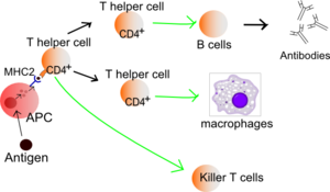 Helper T cells express T cell receptors (TCR) that recognize antigen bound to Class II MHC molecules. The MHC:antigen complex is also recognized by the helper cell's CD4 co-receptor, which recruits molecules inside the T cell (e.g., Lck) that are responsible for the T cell's activation. Helper T cells have a weaker association with the MHC:antigen complex than observed for killer T cells, meaning many receptors (around 200–300) on the helper T cell must be bound by an MHC:antigen in order to activate the helper cell, while killer T cells can be activated by engagement of a single MHC:antigen molecule. Helper T cell activation also requires longer duration of engagement with an antigen-presenting cell. The activation of a resting helper T cell causes it to release cytokines that influence the activity of many cell types. Cytokine signals produced by helper T cells enhance the microbicidal function of macrophages and the activity of killer T cells. In addition, helper T cell activation causes an upregulation of molecules expressed on the T cell's surface, such as CD40 ligand (also called CD154), which provide extra stimulatory signals typically required to activate antibody-producing B cells.