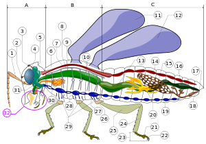 Insect respiration is accomplished without lungs. Instead, the insect respiratory system uses a system of internal tubes and sacs through which gases either diffuse or are actively pumped, delivering oxygen directly to tissues that need it via their trachea (element 8 in numbered diagram). Since oxygen is delivered directly, the circulatory system is not used to carry oxygen, and is therefore greatly reduced. The insect circulatory system has no veins or arteries, and instead consists of little more than a single, perforated dorsal tube which pulses peristaltically. Toward the thorax, the dorsal tube (element 14) divides into chambers and acts like the insect's heart. The opposite end of the dorsal tube is like the aorta of the insect circulating the hemolymph, arthropods' fluid analog of blood, inside the body cavity. Air is taken in through openings on the sides of the abdomen called spiracles.