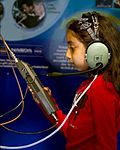 A student speaks to crew using Amateur Radio, provided free by ARISS.