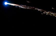 A fuzzy image of the ISS set against a black background, with a smaller, cylindrical object visible to the left of the station. A view of a dark blue, starry sky with a white line visible from the bottom-left to the top-right of the image. A tree is visible to the bottom right.