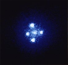 Since light is deflected in a gravitational field, it is possible for the light of a distant object to reach an observer along two or more paths. For instance, light of a very distant object such as a quasar can pass along one side of a massive galaxy and be deflected slightly so as to reach an observer on Earth, while light passing along the opposite side of that same galaxy is deflected as well, reaching the same observer from a slightly different direction. As a result, that particular observer will see one astronomical object in two different places in the night sky. This kind of focussing is well-known when it comes to optical lenses, and hence the corresponding gravitational effect is called gravitational lensing.