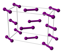 Iodine normally exists as a diatomic molecule with an I-I bond length of 270 pm, one of the longest single bonds known. The I2 molecules tend to interact via the weak van der Waals forces called the London dispersion forces, and this interaction is responsible for the higher melting point compared to more compact halogens, which are also diatomic. Since the atomic size of iodine is larger, its melting point is higher. The solid crystallizes as orthorhombic crystals. The crystal motif in the Hermann–Mauguin notation is Cmca (No 64), Pearson symbol oS8. The I-I bond is relatively weak, with a bond dissociation energy of 36 kcal/mol, and most bonds to iodine are weaker than for the lighter halides. One consequence of this weak bonding is the relatively high tendency of I2 molecules to dissociate into atomic iodine.