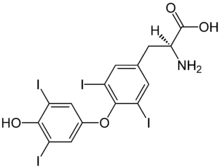 Iodine's main role in animal biology is as a constituent of the thyroid hormones thyroxine (T4) and triiodothyronine (T3). These are made from addition condensation products of the amino acid tyrosine, and are stored prior to release in an iodine-containing protein called thyroglobulin. T4 and T3 contain four and three atoms of iodine per molecule, respectively. The thyroid gland actively absorbs iodide from the blood to make and release these hormones into the blood, actions that are regulated by a second hormone TSH from the pituitary. Thyroid hormones are phylogenetically very old molecules that are synthesized by most multicellular organisms, and that even have some effect on unicellular organisms.