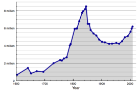 The population of Ireland rose rapidly since the 16th century until the mid-19th century, but a devastating famine in the 1840s caused one million deaths and forced over one million more to emigrate in its immediate wake. Over the following century, the population reduced by over half, at a time when the general trend in European countries was for populations to rise by an average of three-fold.