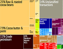 Graphical depiction of Ivory Coast's product exports in 28 colour-coded categories.