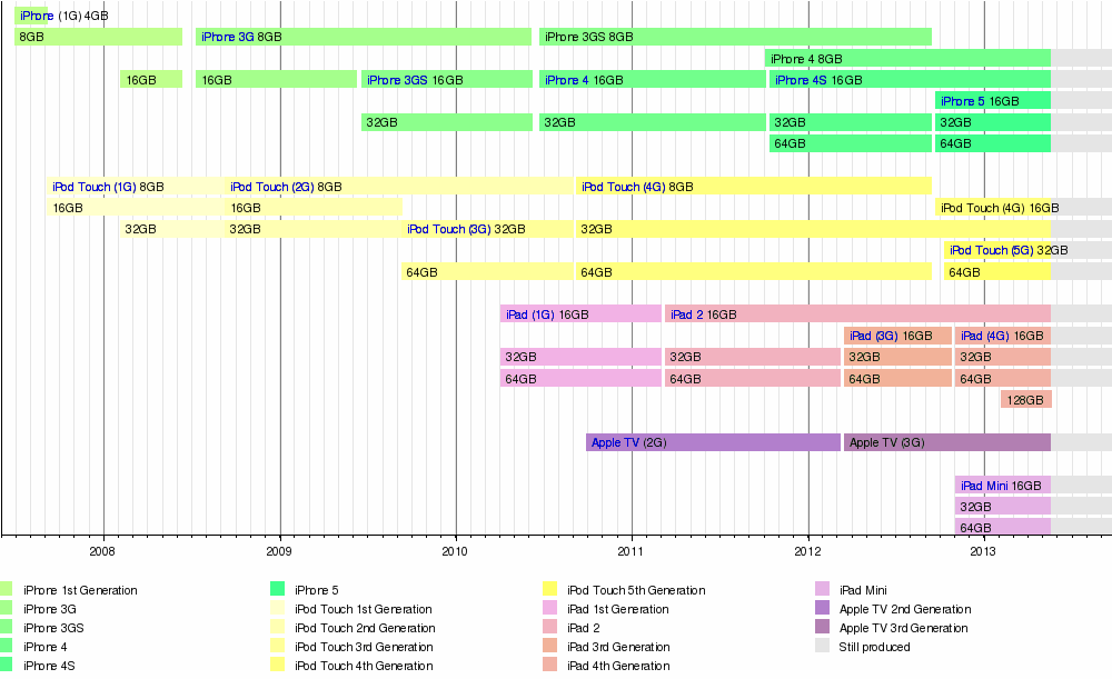 | Model | 1st | 3G | 3GS | 4 | 4S | 5 | 1st | 2nd | 3rd | 4th | 5th | 1st | 2 | 3rd | 4th | 1st | |||||