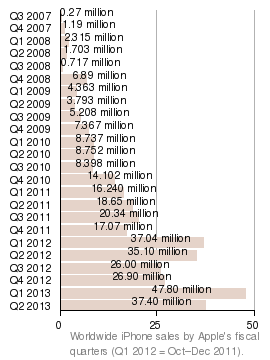 In Q4 2012, the iPhone 5 and iPhone 4S were the best-selling handsets with sales of 27.4 million (13% of smartphones worldwide) and 17.4 million units, respectively, with the Samsung Galaxy S III in third with 15.4 million. According to Strategy Analytics’ data, this was an ”an impressive performance, given the iPhone portfolio’s premium pricing”, adding that the Galaxy SIII’s global popularity “appears to have peaked” (the Galaxy S III was touted as an iPhone-killer by some in the press when it was released). While Samsung has led in worldwide sales of smartphones, Apple's iPhone line has still managed to top Samsung's smartphone offerings in the United States, with 21.4% share and 37.8% in that market, respectively. iOS grew 3.5% to a 37.8%, while Android slid 1.3% to fall to 52.3% share.