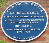There are seven blue plaques in England that commemorate places associated with Tolkien: one in Oxford, one in Bournemouth, four in Birmingham and one in Leeds. One of the Birmingham plaques commemorates the inspiration provided by Sarehole Mill, near which he lived between the ages of four and eight, while two mark childhood homes up to the time he left to attend Oxford University and the other marks a hotel he stayed at before leaving for France during World War I. The plaque in West Park, Leeds, commemorates the five years Tolkien enjoyed at Leeds as Reader and then Professor of English Language at the University. The Oxford plaque commemorates the residence where Tolkien wrote The Hobbit and most of The Lord of the Rings.