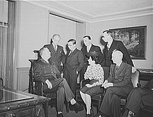 French journalists visit General George C. Marshall at his office in the Pentagon building, 1945