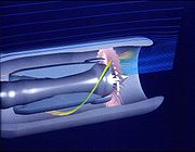 | Precooled jets / LACE | Intake air is chilled to very low temperatures at inlet in a heat exchanger before passing through a ramjet or turbojet engine. Can be combined with a rocket engine for orbital insertion. | Easily tested on ground. Very high thrust/weight ratios are possible (~14) together with good fuel efficiency over a wide range of airspeeds, mach 0-5.5+; this combination of efficiencies may permit launching to orbit, single stage, or very rapid, very long distance intercontinental travel. | Exists only at the lab prototyping stage. Examples include RB545, SABRE, ATREX. Requires liquid hydrogen fuel which has very low density and heavily insulated tankage. |