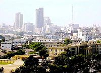 | Counterclockwise from top: Karachi Skyline, M.A. Jinnah Tomb, Karachi Sunday Textile Market, KPT headquarters, Sindh High Court, Kemari Boat Basin and Nagan Interchange | |||