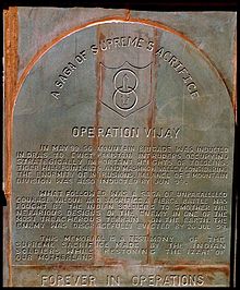 The Kargil War ( Hindi: कारगिल युद्ध kārgil yuddh, Urdu: کارگل جنگ  kārgil jang), also known as the Kargil conflict,[note (I)] was an armed conflict between India and Pakistan that took place between May and July 1999 in the Kargil district of Kashmir and elsewhere along the Line of Control (LOC). The conflict is also referred to as Operation Vijay (Victory in Hindi) which was the name of the Indian operation to clear the Kargil sector.