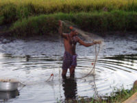 With 590 km of coastal belt, 400,000 hectares of inland water resources and about 220,000 active fishermen, Kerala is one of the leading producers of fish in India. According to 2003–04 reports, about 1.1 million people earn their livelihood from fishing and allied activities such as drying, processing, packaging, exporting and transporting fisheries. The annual yield of the sector was estimated as 608,000 tons in 2003–04. This contributes to about 3% of the total economy of the state. In 2006, about 22% of the total Indian marine fishery yield was from the state. During the southwest monsoon, a suspended mud bank would be developed along the shore, which in turn leads to calm ocean water and hence peak output from the fishery industry. This phenomenon is locally called chakara. The fish landings consist of a large variety: pelagic species; 59%, demersal species; 23%, crustaceans and molluscs.