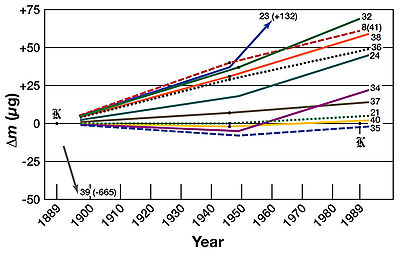 Note that none of the replicas has a mass precisely equal to that of the IPK; their masses are calibrated and documented as offset values. For instance, K20, the U.S.'s primary standard, originally had an official mass of 1 kg − 39 micrograms (μg) in 1889; that is to say, K20 was 39 µg less than the IPK. A verification performed in 1948 showed a mass of 1 kg − 19 µg. The latest verification performed in 1999 shows a mass precisely identical to its original 1889 value. Quite unlike transient variations such as this, the U.S.'s check standard, K4, has persistently declined in mass relative to the IPK—and for an identifiable reason. Check standards are used much more often than primary standards and are prone to scratches and other wear. K4 was originally delivered with an official mass of 1 kg − 75 µg in 1889, but as of 1989 was officially calibrated at 1 kg − 106 µg and ten years later was 1 kg − 116 µg. Over a period of 110 years, K4 lost 41 µg relative to the IPK.