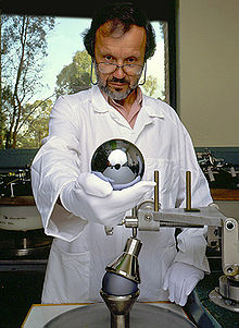 Experiments are being performed on the Avogadro Project’s silicon spheres to determine whether their masses are most stable when stored in a vacuum, a partial vacuum, or ambient pressure. However, no technical means currently exist to prove a long-term stability any better than that of the IPK’s because the most sensitive and accurate measurements of mass are made with dual-pan balances like the BIPM’s FB‑2 flexure-strip balance (see External links, below). Balances can only compare the mass of a silicon sphere to that of a reference mass. Given the latest understanding of the lack of long-term mass stability with the IPK and its replicas, there is no known, perfectly stable mass artifact to compare against. Single-pan scales, which measure weight relative to an invariant of nature, are not precise to the necessary long-term uncertainty of 10–20 parts per billion. Another issue to be overcome is that silicon oxidizes and forms a thin layer (equivalent to 5–20 silicon atoms) of silicon dioxide (quartz) and silicon monoxide. This layer slightly increases the mass of the sphere, an effect which must be accounted for when polishing the sphere to its finished dimension. Oxidation is not an issue with platinum and iridium, both of which are noble metals that are roughly as cathodic as oxygen and therefore don’t oxidize unless coaxed to do so in the laboratory. The presence of the thin oxide layer on a silicon-sphere mass prototype places additional restrictions on the procedures that might be suitable to clean it to avoid changing the layer’s thickness or oxide stoichiometry.