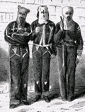 One of these teachers (Miss Allen of Illinois), whose school was at Cotton Gin Port in Monroe County, was visited ... between one and two o'clock in the morning on March 1871, by about fifty men mounted and disguised. Each man wore a long white robe and his face was covered by a loose mask with scarlet stripes. She was ordered to get up and dress which she did at once and then admitted to her room the captain and lieutenant who in addition to the usual disguise had long horns on their heads and a sort of device in front. The lieutenant had a pistol in his hand and he and the captain sat down while eight or ten men stood inside the door and the porch was full. They treated her "gentlemanly and quietly" but complained of the heavy school-tax, said she must stop teaching and go away and warned her that they never gave a second notice. She heeded the warning and left the county.