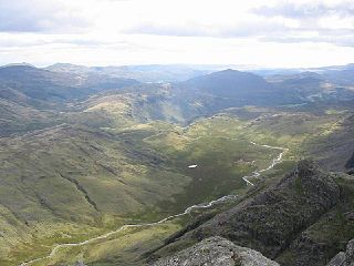 The mid-western fells form a triangular shape, with the corners at the Irish Sea, Borrowdale and Langdale. They comprise the Wastwater Screes overlooking Wasdale, the Glaramara ridge overlooking Borrowdale, the three tops of Crinkle Crags, Bowfell and Esk Pike overlooking Langdale and Scafell Pike in the centre, at 3,209 feet (978 m) the highest ground in England. Scafell one mile (1.6 km) to the south-west is slightly lower but has a 700-foot (210 m) rock face on its north face, Scafell Crag. The valley of Eskdale penetrates this upland wilderness. These fells are the most rugged and craggy of all, and consequently going is slower amongst the tumbled granite.