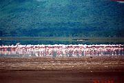There are two types of flamingo species: the Lesser flamingo can be distinguished by its deep red carmine bill and pink plumage unlike the greater, which has a bill with a black tip. The Lesser flamingos are ones that are commonly pictured in documentaries mainly because they are large in number. The number of Flamingos has been decreasing recently, perhaps due to too much tourism, pollution resulting from industries waterworks nearby who dump waste into the waters or simply because of changes in water quality which makes the lake temporarily inhospitable. Usually, the lake recedes during the dry season and floods during the wet season.