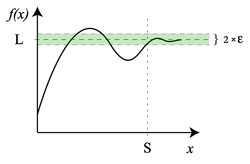 A more general definition applies for functions defined on subsets of the real line. Let (a,b) be an open interval in R, and p a point of (a,b). Let f be a real-valued function defined on all of (a, b) except possibly at p. We then say that the limit of f as x approaches p is L if and only if, for every real ε > 0 there exists a real δ > 0 such that 0 < | x - p | < δ and x ∈ (a,b) implies | f(x) - L | < ε. Note that the limit does not depend on f(p) being well-defined.