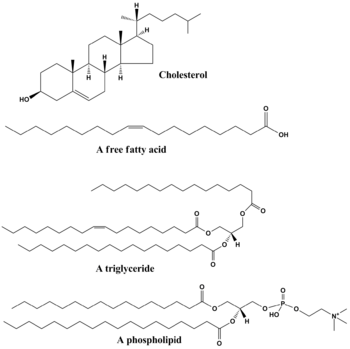 Lipids are broadly defined as any fat-soluble ( lipophilic), naturally-occurring molecule, such as fats, oils, waxes, cholesterol, sterols, fat-soluble vitamins (such as vitamins A, D, E and K), monoglycerides, diglycerides, phospholipids, and others. The main biological functions of lipids include energy storage, acting as structural components of cell membranes, and participating as important signaling molecules.