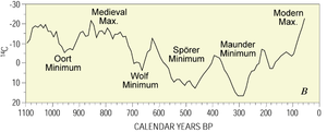During the period 1645–1715, in the middle of the Little Ice Age, there was a period of low solar activity known as the Maunder Minimum. The physical link between low sunspot activity and cooling temperatures has not been established, but the coincidence of the Maunder Minimum with the deepest trough of the Little Ice Age is suggestive of such a connection. The Spörer Minimum has also been identified with a significant cooling period near the beginning of the Little Ice Age. Other indicators of low solar activity during this period are levels of the isotopes carbon-14 and beryllium-10.
