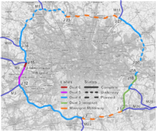 J12 → M3 motorway Junction 2 J15 → M4 motorway Junction 4b J16 → M40 motorway Junction 1a J21 → M1 motorway Junction 6a J23 → A1(M) motorway Junction 1 J27 → M11 motorway Junction 6  |
