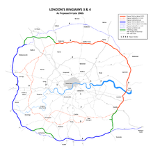 The M25 motorway or London Orbital motorway is a 117-mile (188 km) motorway that (almost) encircles Greater London, England, in the United Kingdom. The motorway was first mooted early in the 20th century as part of the plan to build four ring roads around London. A few sections, based on the abandoned London Ringways plan, were constructed in the early 1970s and it was completed in 1986. At 117 miles (188 km) (including the A282), the M25 is Europe's second longest orbital road after the Berliner Ring, which is 122 miles (196 km) long.