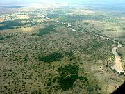 The Maasai Mara National Reserve (MMNR) covers some 1,510 km2 (583 sq mi) in south-western Kenya. It is the northern-most section of the Mara-Serengeti ecosystem, which covers some 25,000 km2 (9,700 sq mi) in Tanzania and Kenya. It is bounded by the Serengeti Park to the south, the Siria escarpment to the west, and Maasai pastoral ranches to the north, east and west. Rainfall in the ecosystem increases markedly along a southeast–northwest gradient, varies in space and time, and is markedly bimodal. The Sand, Talek River and Mara River are the major rivers draining the reserve. Shrubs and trees fringe most drainage lines and cover hillslopes and hilltops.