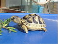 Tortoises can thrive in captivity if the owner understands their needs well. A heat lamp is attached to the tortoise's table, directed in such a way that the 60- watt reflector bulb is some 15–20 cm (6–8 in) from the floor of the table, which is covered with about 5 cm of substraite, loam based soil and play sand. When the lamp is turned on in the morning, the animals emerge from the ground, bask in the light to warm themselves, and begin to eat. They should be fed several times a day with clover, dandelions and garden weeds (check first as a few are harmful). Some owners give pellet food occasionally, these should be avoided, only feed your tortoise what they would naturally eat in the wild, their digestive systems do not cope well with protein, of which there is a lot in pellet foods. The animals also require ultraviolet light, thus they should be allowed to bask in the sunlight daily, but for only a short period of time. In the summer, they can be taken outdoors for this purpose, in the winter if not hybernated they need access to UVB light every day this can be provided in the form of a UVB/UVA emitting bulb, existing marketed brands include Creature World, Exo Terra and the more well known Repti Glo. Care must be taken to avoid allowing the tortoise to overheat to help, use water in a shallow dish or(use a digital thermometer to keep a check).