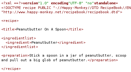 Example of RecipeBook, a simple markup language based on XML for creating recipes. The markup can be converted to HTML, PDF and Rich Text Format using a programming language or XSL.