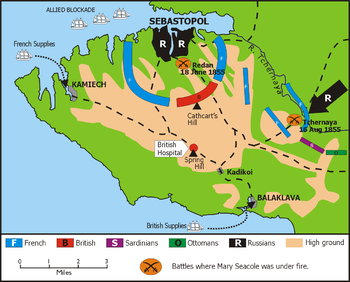 Seacole often went out to the troops as a sutler, selling her provisions near the British camp at Kadikoi, and attending to casualties brought out from the trenches around Sevastopol or from the Tchernaya valley. She was widely known to the British Army as "Mother Seacole".
